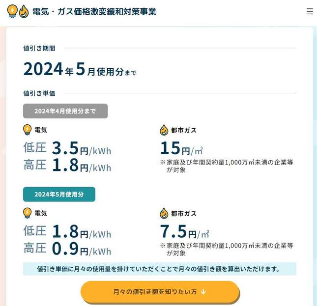 一方、物価高騰対策として続けてきた電気・ガス料金の負担軽減措置は5月の使用分までで終了。電気料金については1 kwhあたり、家庭向けで3.5円、企業向けで1.8円を補助してきたが、5月の使用分では半分程度に縮小。6月からは負担軽減措置が完全に終了する。