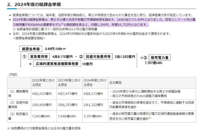 経済産業省によれば、24年度の再エネ賦課金は1キロワット時(kwh)あたり3.49円になる。23年度の賦課金は1.40円だったため、24年度は2.09円高くなる。