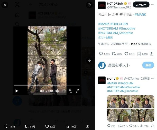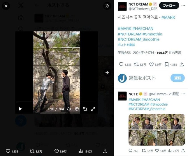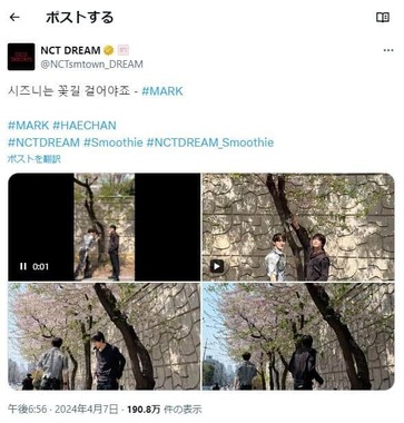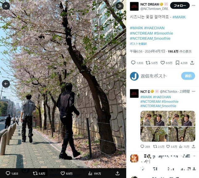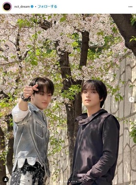 グループ公式Xは7日、桜並木の下で撮影したメンバーのマークさん、ヘチャンさんの写真を公開。併せて、写真の演出のためか、マークさんが木の幹を小刻みに何度も揺らし、桜の花を散らせている場面の動画も披露した。