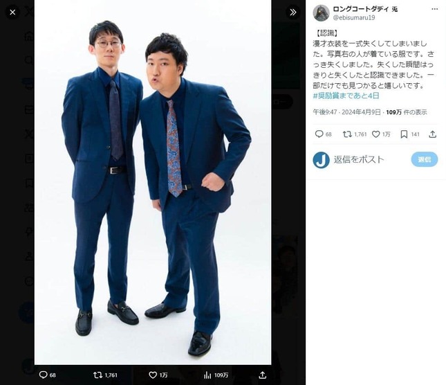 お笑いコンビ「ロングコートダディ」の兎さんが2024年4月9日にXで、「漫才衣装を一式失くしてしまいました」と明かした。