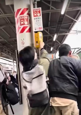 「お前、来いよ! クソジジイ」。若い男性は、上野駅で開いたドアから、年配男性を引っ張り出す。年配男性は、「誰か呼んでくれ」と周囲に助けを求めるが、若い男性は、年配男性を引きずったまま、ホームの非常停止ボタンを押した。