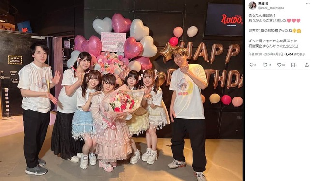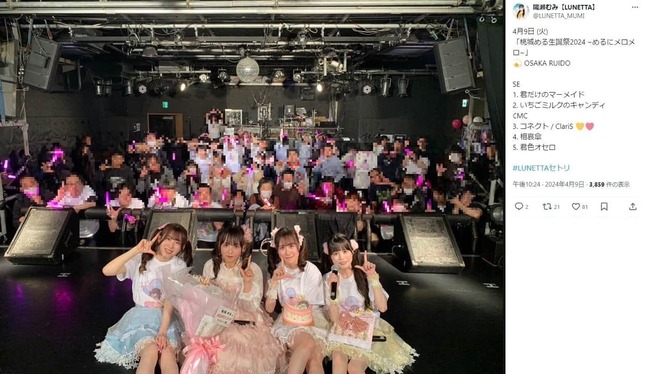 アイドルグループ「LUNETTA」の桃城めるさんの誕生日を祝うイベント「生誕祭」が2024年4月9日に開催された。イベント後にグループのプロデューサーがXで、桃城さんの実の祖母が客席の最前列でイベントを見られるよう、ファンが場所を譲っていたと明かし、桃城さん本人も感謝を伝えた。Xではほっこりしたとの反響が寄せられている。