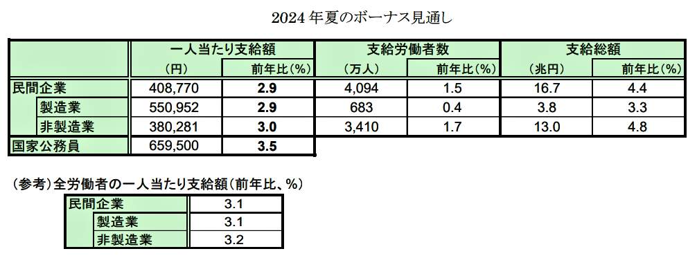 2024年夏の民間企業のボーナスは、1人当たり40万8700円(前年比2.9%増)で、3年連続で増加が見込まれる。好調な企業業績と堅調な雇用情勢が追い風となり、前年からの伸びは加速しそうだ【図表1】。