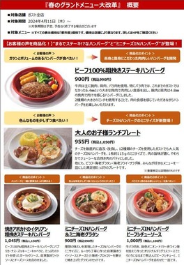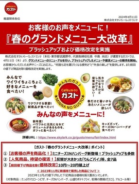 すかいらーくホールディングスは、「春のグランドメニュー大改革」として新商品や過去商品の復活の発表とともに、一部商品の値上げを発表した。ガストは23年11月に「たっぷりマヨコーンピザ」、「チーズINハンバーグ」、「山盛りポテトフライ」、アルコール類など30品目を値下げしているが、この時値下げされた商品は対象外となり、価格は据え置かれる。