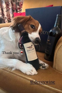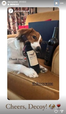 大谷選手がインスタグラムのストーリーに公開したのは、愛犬・デコピンがワインの「DECOY」(デコイ)をかじっている写真2枚。