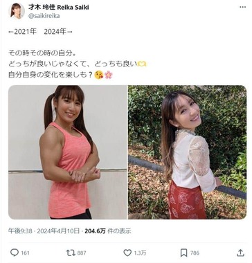 元「筋肉アイドル」でタレントの才木玲佳(さいき・れいか)さん(31)がXに2021年と24年の自身の比較ショットを載せ、話題となっている。