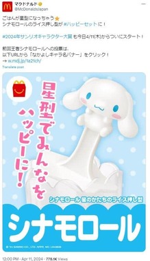 むかえた発売前日の4月11日、日本マクドナルドの公式Xで、前述の文章とともに、おもちゃのひとつである「シナモロールのライス押し型」の画像をアップ。画像には「星型でみんなをハッピーに!」という文章を添えている。
