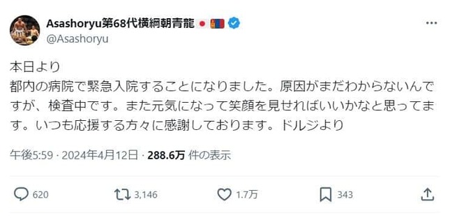 大相撲の第68代横綱・朝青龍のドルゴルスレン・ダグワドルジさん(43)が2024年4月12日、自身のX(@Asashoryu)を更新し、「都内の病院で緊急入院することになりました」と明かした。