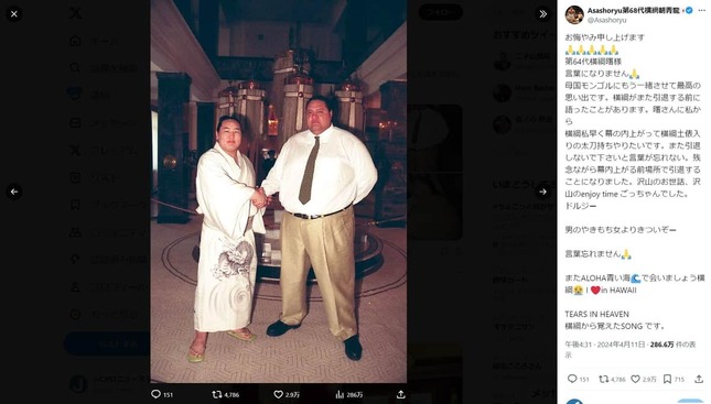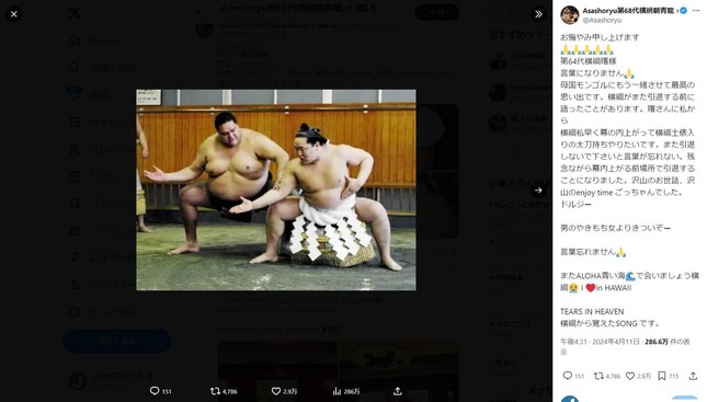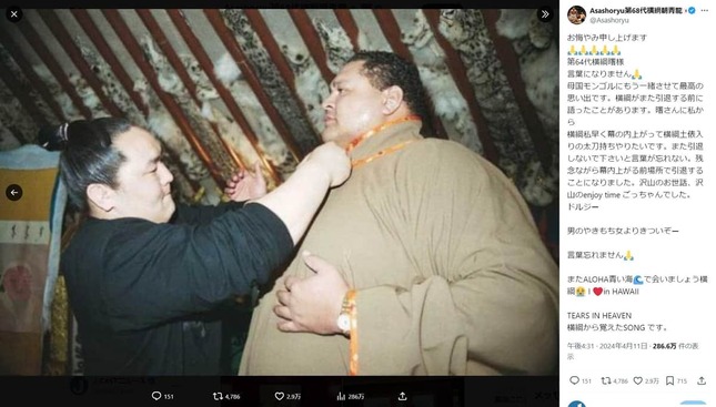 前日、4月11日のXでは、元横綱で格闘家の曙太郎(あけぼの・たろう)さんの死去を受け、「お悔やみ申し上げます」「第64代横綱曙様」「言葉になりません」とつづり、曙さんの思い出とともにしのんだばかりだった。