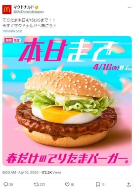 日本マクドナルドは2024年4月16日、X公式「マクドナルド」(@McDonaldsJapan)で、毎年春の期間限定の定番商品「てりたまバーガー」の提供が本日(4月16日)までだとアピールしている。