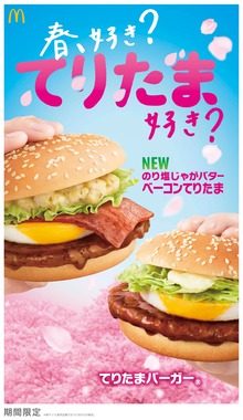 マクドナルドでは3月6日から期間限定で、テリヤキソースのパティに目玉焼きの乗った「てりたまバーガー」や、チーズをトッピングした「チーズてりたま」、新登場の「のり塩じゃがバターベーコンてりたま」など6種類を売り出していた。