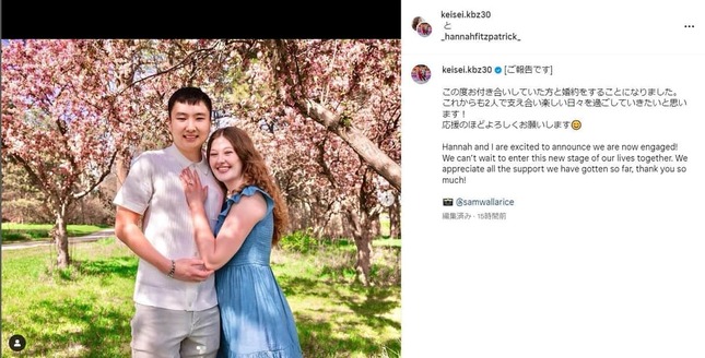 婚約相手はハンナ・フィッツパトリックさん。ハンナさんのインスタグラムには富永選手との仲睦まじい様子の写真が複数投稿されていた。