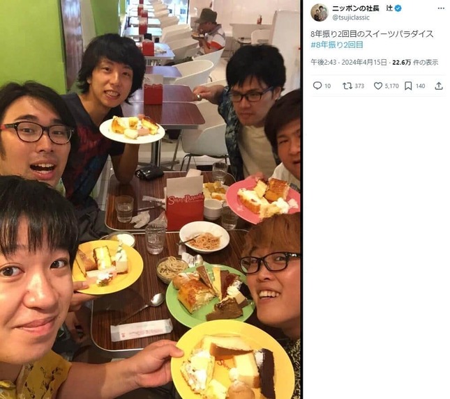 辻さんはXで「8年振り2回目のスイーツパラダイス」として、デザートバイキング店「スイーツパラダイス」でケーキを食べるビスケットブラザーズのきんさん(32)の現在の写真を投稿した。同時に、3組6人でスイーツの載った皿を囲む8年前の写真も添えた。