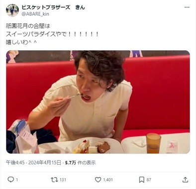 きんさんも15日、Xでケーキを食べる辻さんの動画とともに、「祇園花月の合間はスイーツパラダイスやで!!!!!!嬉しいわ」と、京都の吉本興業の劇場「よしもと祇園花月」の出番の合間にスイーツパラダイスを訪れたことを明かした。
