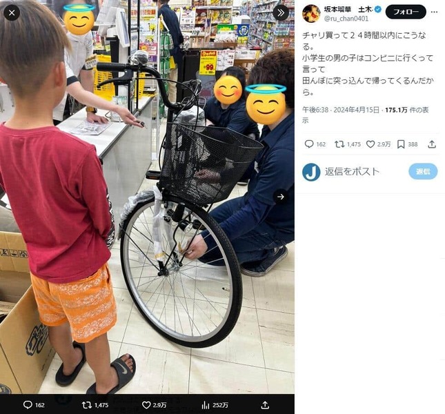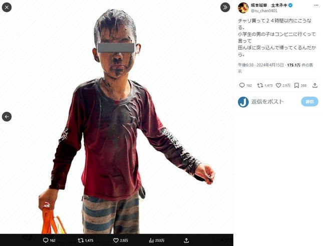 坂本さんは15日にXで、「息子にチャリ買った翌日。こんなことある?」とし、全身が泥にまみれた息子の姿を公開した。続く投稿では、「チャリ買って24時間以内にこうなる。小学生の男の子はコンビニに行くって言って田んぼに突っ込んで帰ってくるんだから」と息子に手を焼く様子だった。怪我はなく、自転車も無事だったという。