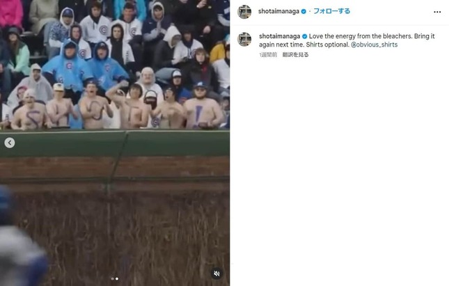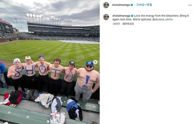 そんなやり取りを経て、Tシャツ会社「Obvious Shirt」が、「ショウタは6人に、Tシャツを購入したいと考えている。Tシャツを個人的に贈りたいそうだ。DMしてくれ」とインスタグラムに投稿。今永投手は6人がTシャツを着た状態で同じように応援できるよう、Tシャツをプレゼントすると提案したのだ。