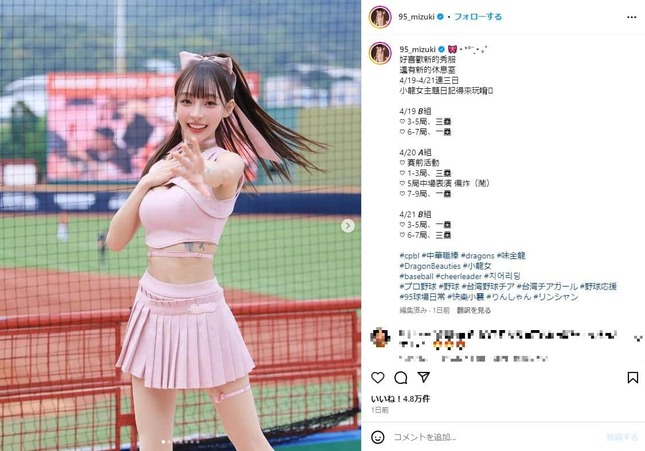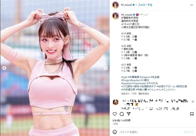 日本でも数多くのファンを持つ台湾の人気チアガール、林襄(リン・シャン)さんがチアコスチュームからタトゥーがのぞく姿を投稿し、話題となっている。