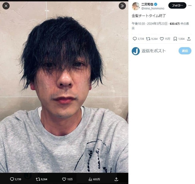 嵐の二宮和也さんがXに自撮り写真を投稿し、その髪色の変化にファンらから反響が寄せられている。