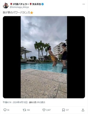 友永さんはXで「我が家のパワーバランス」として、プールの中で岩間さんと遊んでいる動画を公開した。