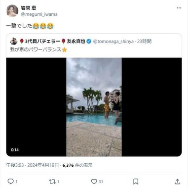 岩間さんも19日、Xで友永さんの動画用し、涙を流して笑う絵文字とともに「一撃でした」と投稿している。