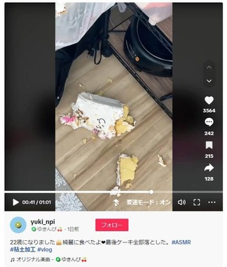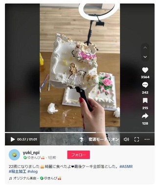 問題となっているのは、ゆきんぴさんが大きな白いケーキを食べるという動画。ケーキには火のついたロウソクが立っていて、「22歳になりました」「綺麗に食べたよ 最後ケーキ全部落とした」と記されていた。