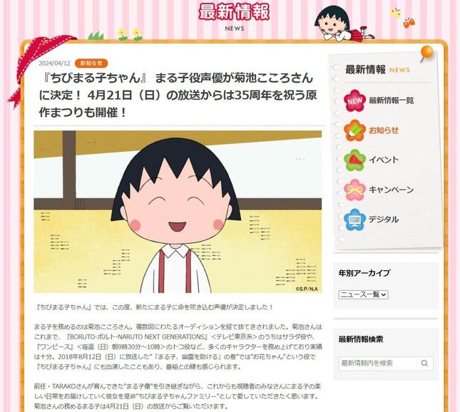 2代目まるちゃん役として、菊池さんの起用が発表されたのは24年4月12日。公式X「ちびまる子ちゃん【公式】」(@tweet_maruko)では、「どうか温かい目でお迎えいただき、ぜひ応援をお願いいたします」とのコメントを発表。