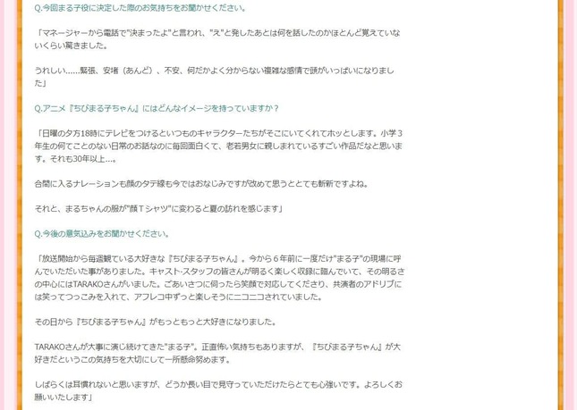 また、「ちびまる子ちゃん オフィシャルサイト」でも、「TARAKOさんが大事に演じ続けてきた『まる子』。正直怖い気持ちもありますが、『ちびまる子ちゃん』が大好きだというこの気持ちを大切にして一所懸命努めます。しばらくは耳慣れないと思いますが、どうか長い目で見守っていただけたらとても心強いです。よろしくお願いいたします」と意気込みを語っていた。