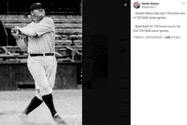 大谷選手とベーブ・ルースの共通点を指摘したのは、ドミニカ共和国出身のヘクター・ゴメス記者。自身のXで、大谷選手もベーブ・ルースも、ともに725試合目で176号ホームランを放ったことを投稿したのだ。