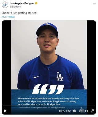 大谷選手が通算176号ホームランを放ったこの日、ドジャース公式Xは大谷選手の動画を投稿し、大谷選手は「人が多く入っているので歓声も凄く多いですし、まだ数本しか打っていないので、もっともっと何十本、何百本と打てるように頑張りたいなと思います」とコメントした。