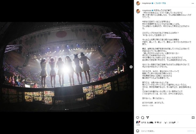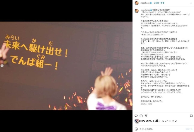 最上さんの投稿には、「もがちゃんにもでんぱ組にも出会えてよかったって心から思います」「もがちゃんの言葉を読んで、私もなんだか一区切りつけられる気がしたよ」「もがちゃん含め、でんぱ組.incは私の青春です 本当にありがとう!」といった声が寄せられている。