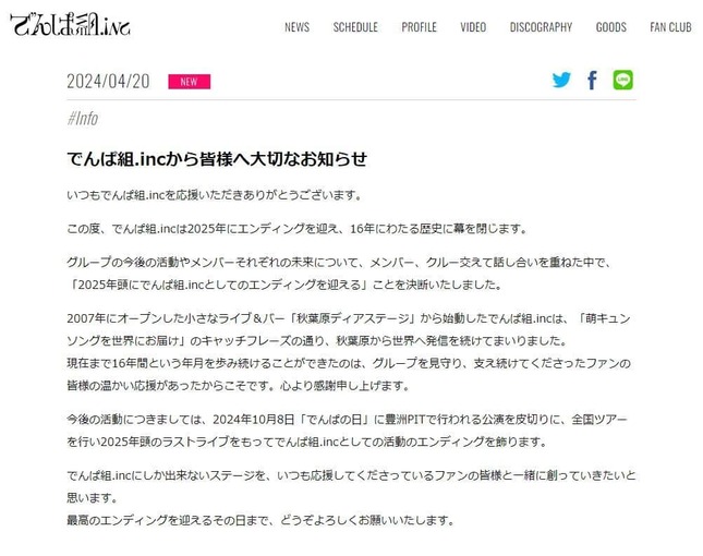 結成16年を迎える「でんぱ組.inc」公式サイトは24年4月20日、「グループの今後の活動やメンバーそれぞれの未来について、メンバー、クルー交えて話し合いを重ねた中で、『2025年頭にでんぱ組.incとしてのエンディングを迎える』ことを決断いたしました」と発表した。最上さんは17年にグループ脱退し、ソロ活動を続けている。私生活では2歳娘の母でもある。