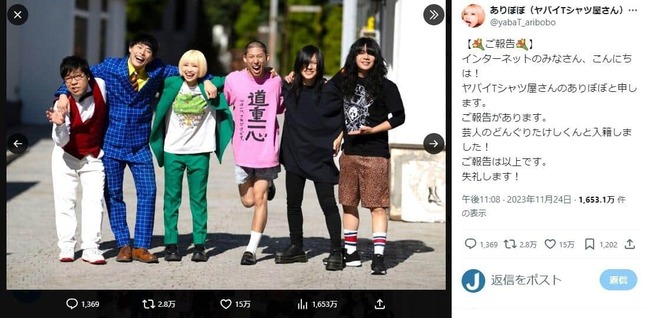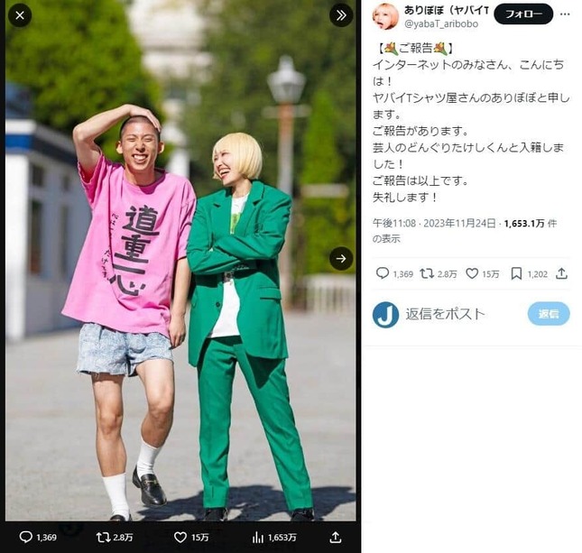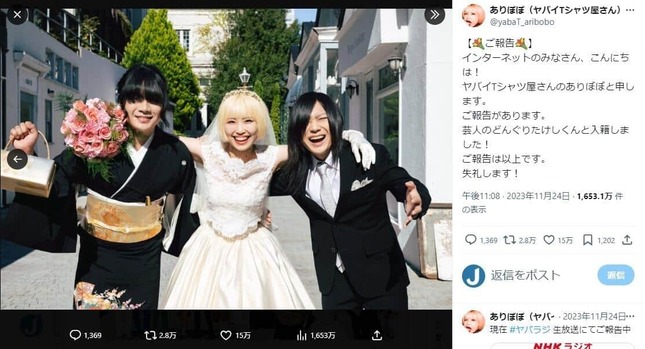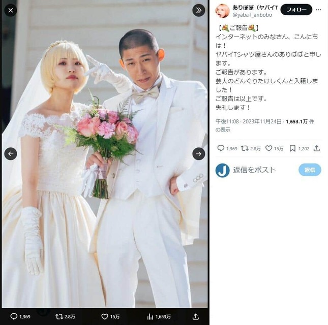 ありぼぼさんは23年11月24日にXで、どんぐりたけしさんとの結婚を報告した。