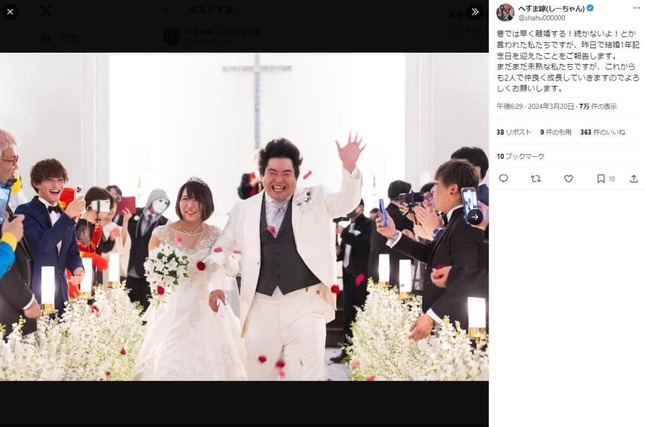 • 結婚当時の2人。しーちゃんさんのX(@shahu000000)より