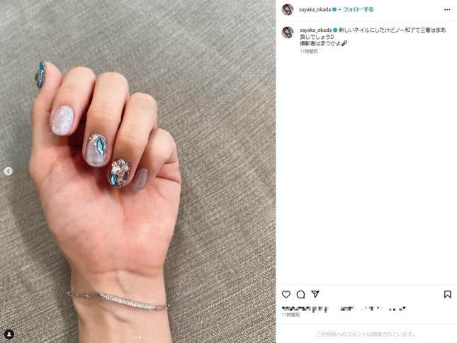 岡田さんは同日にプロ麻雀リーグ「朝日新聞Mリーグ 2023-24」セミファイナルシリーズに出場しており、「新しいネイルにしたけどノー和了で三着はまあ良しでしょう」と結果を交えて投稿した。