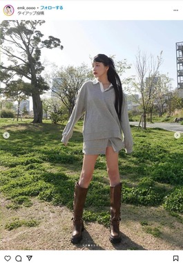 写真のえみ姉さんは襟付きのグレーのトップスとショートパンツのセットアップに、ブラウンのロングブーツを合わせており、「このコーデもお気に入り!特にブーツ」と明かした。