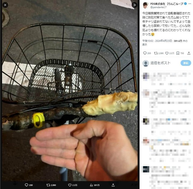 ダンテさんは投稿で、職務質問を受けた際に自転車を確認されたと明かした。警官に対し、「防犯対策で食べたガム貼ってて7年チャリ盗まれてないんですよって自慢」したところ、相手は「苦笑いで引いてた」という。