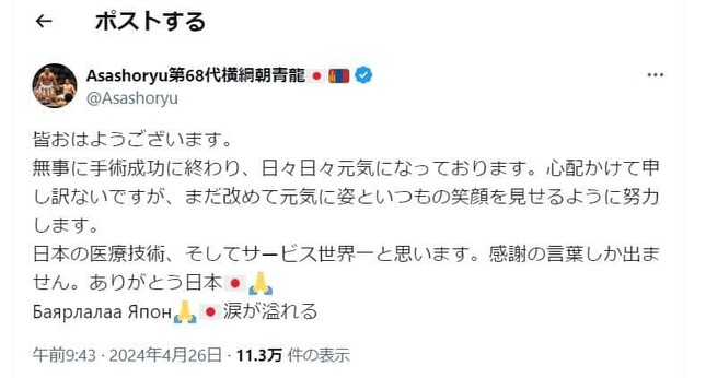 大相撲の第68代横綱・朝青龍のドルゴルスレン・ダグワドルジさん(43)が2024年4月26日、自身のX(@Asashoryu)を更新し、「無事に手術成功に終わり、日々日々元気になっております」と報告した。