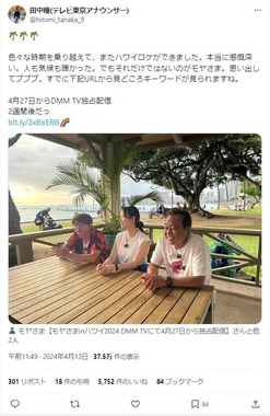 13日にテレビ東京の田中瞳アナウンサーがXで、「色々な時期を乗り越えて、またハワイロケができました。本当に感慨深い。人も気候も暖かった。でもそれだけではないのがモヤさま」として、27日から動画配信サービス「DMM TV」で配信される「モヤモヤさまぁ~ず2やっぱりTHEリゾートなんだかんだでハワイだよね2024」について告知。25日に三村さんがこのポストを引用し、「あさってですねー。楽しかった!」と投稿した。