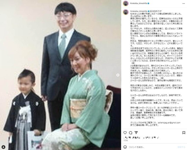 木下さんは投稿で、「昔シリーズです。七五三、オランダ、ガチモヒカン、どれも懐かしいです」と大維志さんの幼少期の写真を複数披露した。「JJは5年生位まではモヒカンでした」と明かす。インターナショナルスクール時代は髪型の規則などは「ほぼ皆無」だったとし、