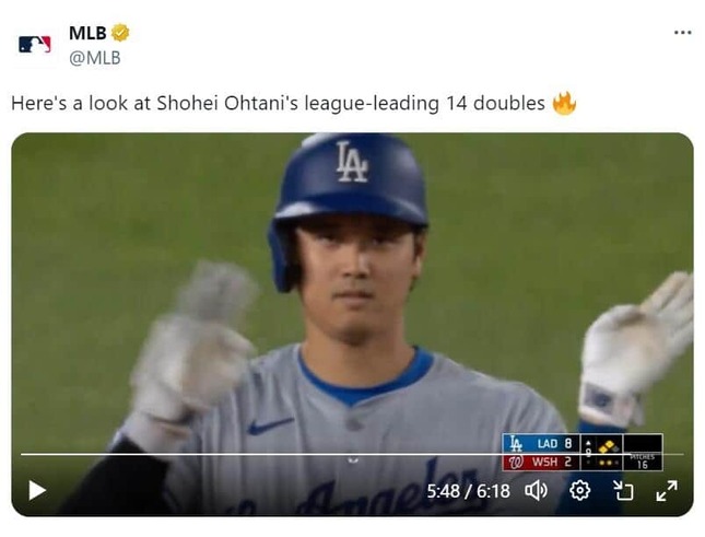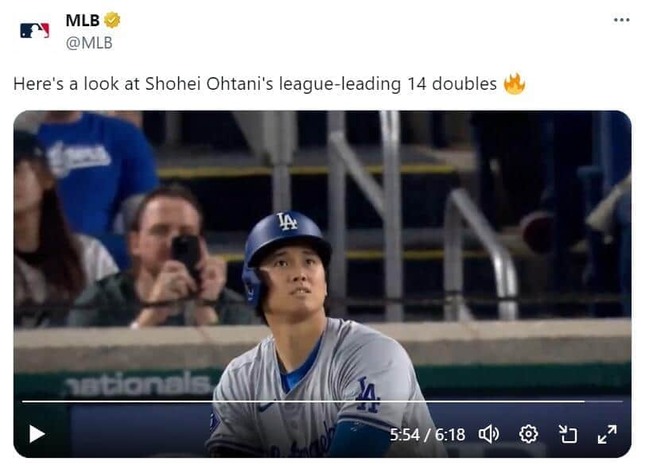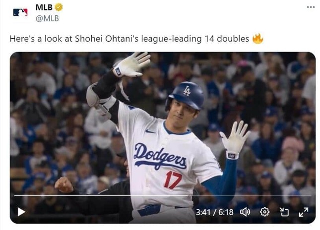 MLB公式Xが2024年4月25日(日本時間)、ロサンゼルス・ドジャースの大谷翔平選手が今シーズン放った二塁打14本をまとめた動画を公開した。これには「MLB公式さんもついついまとめたくなる大谷さんの二塁打」など話題になっている。