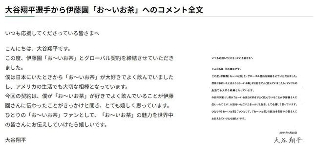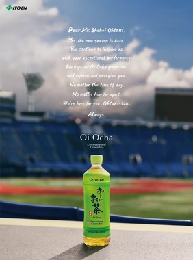 ロサンゼルス・ドジャースの大谷翔平選手が、伊藤園の緑茶飲料ブランド「お~いお茶」とグローバル契約を締結したことが2024年4月30日に発表された。「お~いお茶」から大谷選手へ、そして大谷選手から「お~いお茶」へメッセージがホームページ上で公開された。
