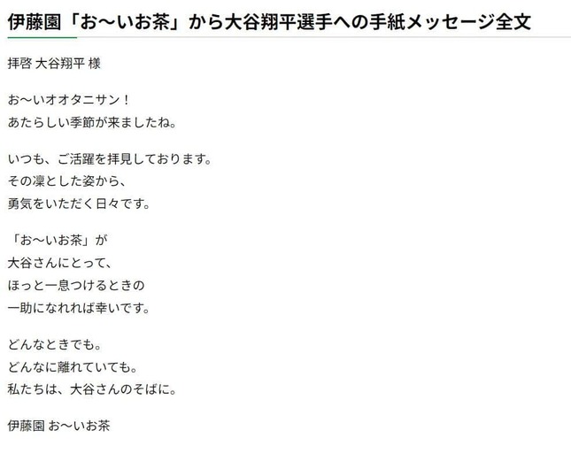 「お~いお茶」から大谷選手への手紙メッセージ全文は以下の通り。
