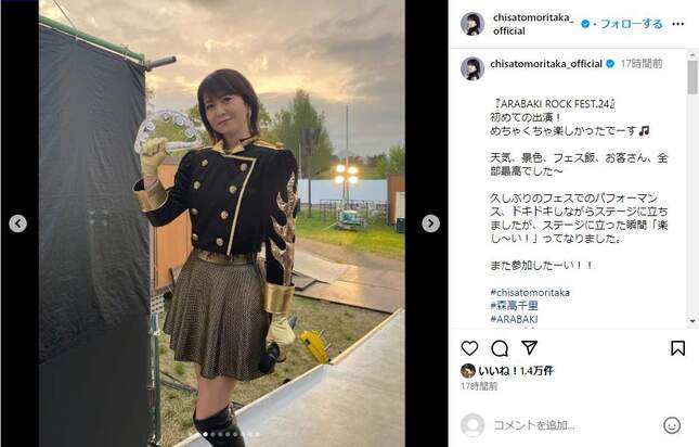• 「ARABAKI ROCK FEST.24」出演を報告。森高千里さんのインスタグラム(@chisatomoritaka_official)より