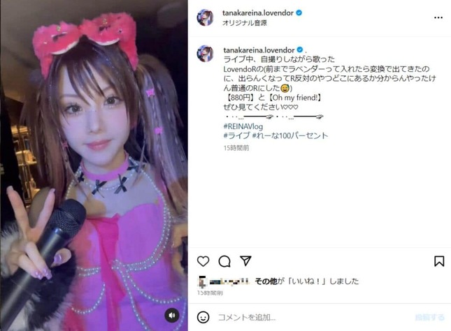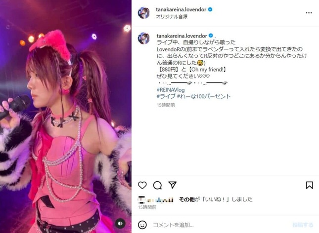 田中さんは「ライブ中、自撮りしながら歌った」とし、ライブ中に自撮りしながら歌う姿を披露した。田中さんは高い位置のツインテールに、ピンクを基調とした衣装を身にまとっている。