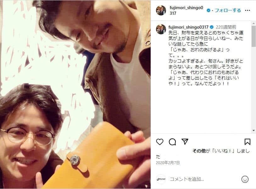 写真は、小栗さんが藤森さんに黄色の財布を手渡しているもの。藤森さんは、「先日、財布を変えるとめちゃくちゃ運気が上がる日が今日らしいねー、みたいな話してたら急に『じゃあ、おれのあげるよ』って。。。」とメッセージを添えていて、小栗さんが私物の財布を藤森さんにあげた際の写真であることを明かした。