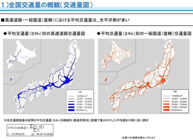 渋滞対策について、国土交通省のウェブサイトで調べてみた。同省では高速道路において、NEXCOデータと都市高速データを収集の上、全国と3大都市圏で渋滞多発箇所、特定日・特定時間帯の混雑箇所を抽出。対策として「路肩の柔軟な運用」(暫定三車線化)、「付加車線の設置」(合流車線の延長)、「勾配のある高速道路サグ部での自発光式ペースメーカーの設置」を行っている。