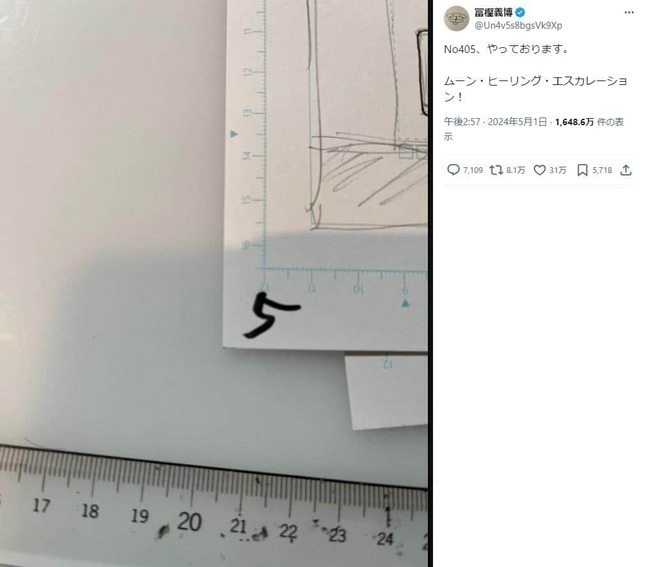 冨樫さんはXで「No405、やっております」として、「週刊少年ジャンプ」に不定期掲載中の「HUNTER×HUNTER」のものとみられる、「5」と書かれた原稿の一部の写真を公開した。