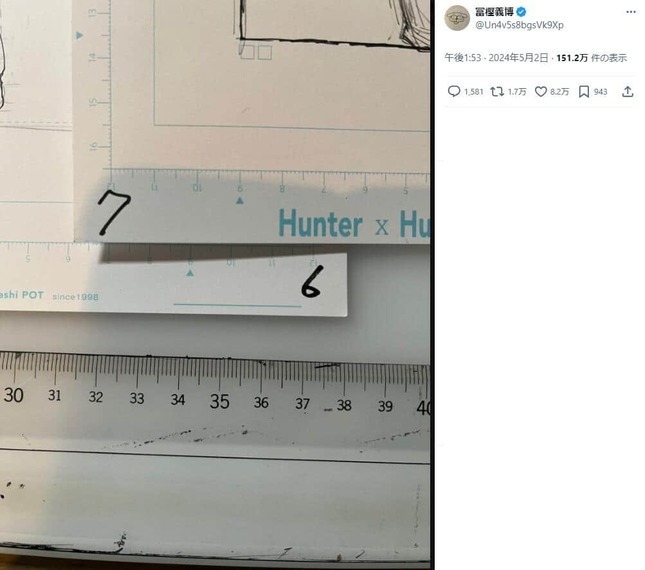 さらに冨樫さんは2日にも、「6」「7」と書かれた、「HUNTER×HUNTER」の題名が見切れた原稿の写真をXに投稿している。連載再開への期待は高まるばかりだ。