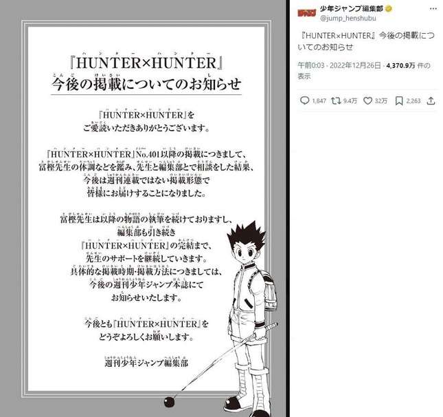 「HUNTER×HUNTER」は22年10月24日発売の「週刊少年ジャンプ」で連載を再開。11月4日にはコミックス37巻も発売されたが、12月26日、同誌編集部が「『HUNTER×HUNTER』No.401以降の掲載につきまして、冨樫先生の体調などを鑑み、先生と編集部とで相談をした結果、今後は週刊連載ではない掲載形態で皆様にお届けすることになりました」「冨樫先生は以降の物語の執筆を続けておりますし、編集部も引き続き『HUNTER×HUNTER』の完結まで、先生のサポートを継続していきます」と発表していた。
