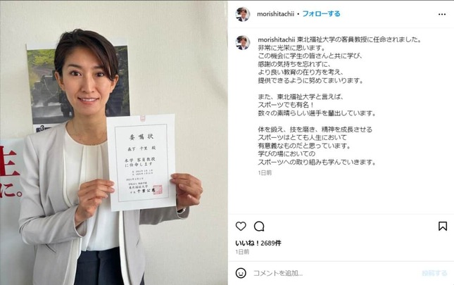 レースクイーンやグラビアアイドルとして活躍した森下千里さん(42)が2024年5月1日、東北福祉大学(仙台市)の客員教授に任命されたとインスタグラムで報告した。